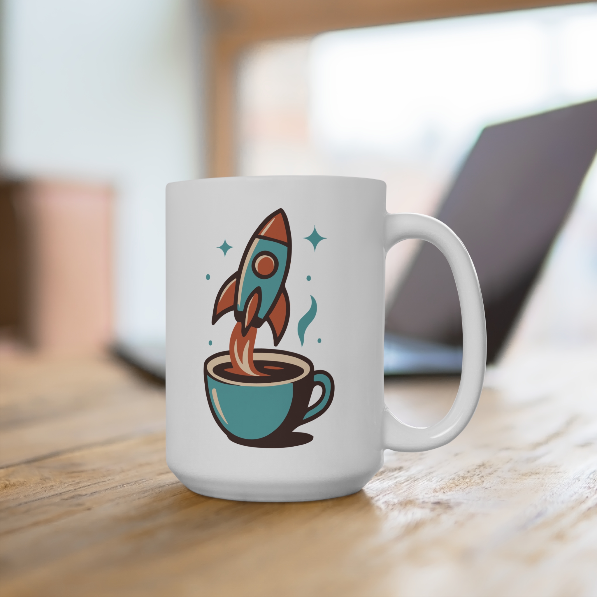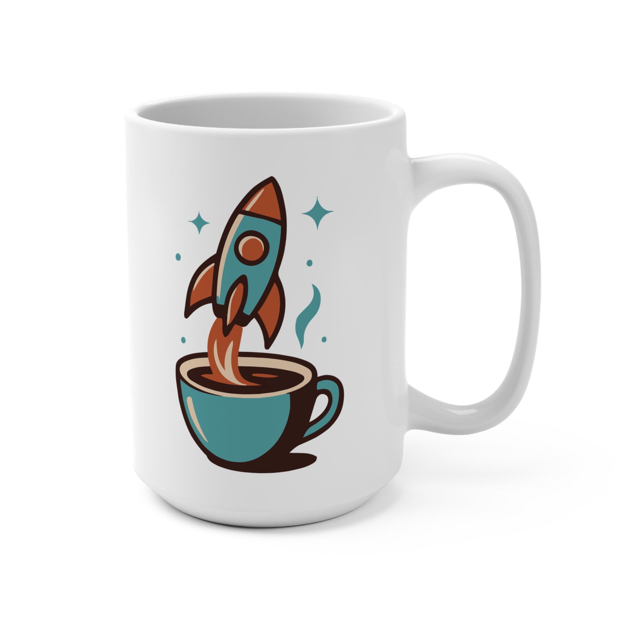 Bright morning starts and late-night brainstorming both feel a little more adventurous with this 15oz ceramic mug. A retro coffee space rocket blasts off across a clean white canvas, little stars twinkling around them — the kind of simple, spirited art that nudges curiosity and invites a smile with every sip. Warm coffee or cooling tea, this mug holds generous servings while its durable ceramic finish keeps the illustration crisp through daily use. It sits easily in hand thanks to a rounded shape and roomy C-handle, becoming a familiar companion at the desk, by the window, or during cozy evenings with a notebook.