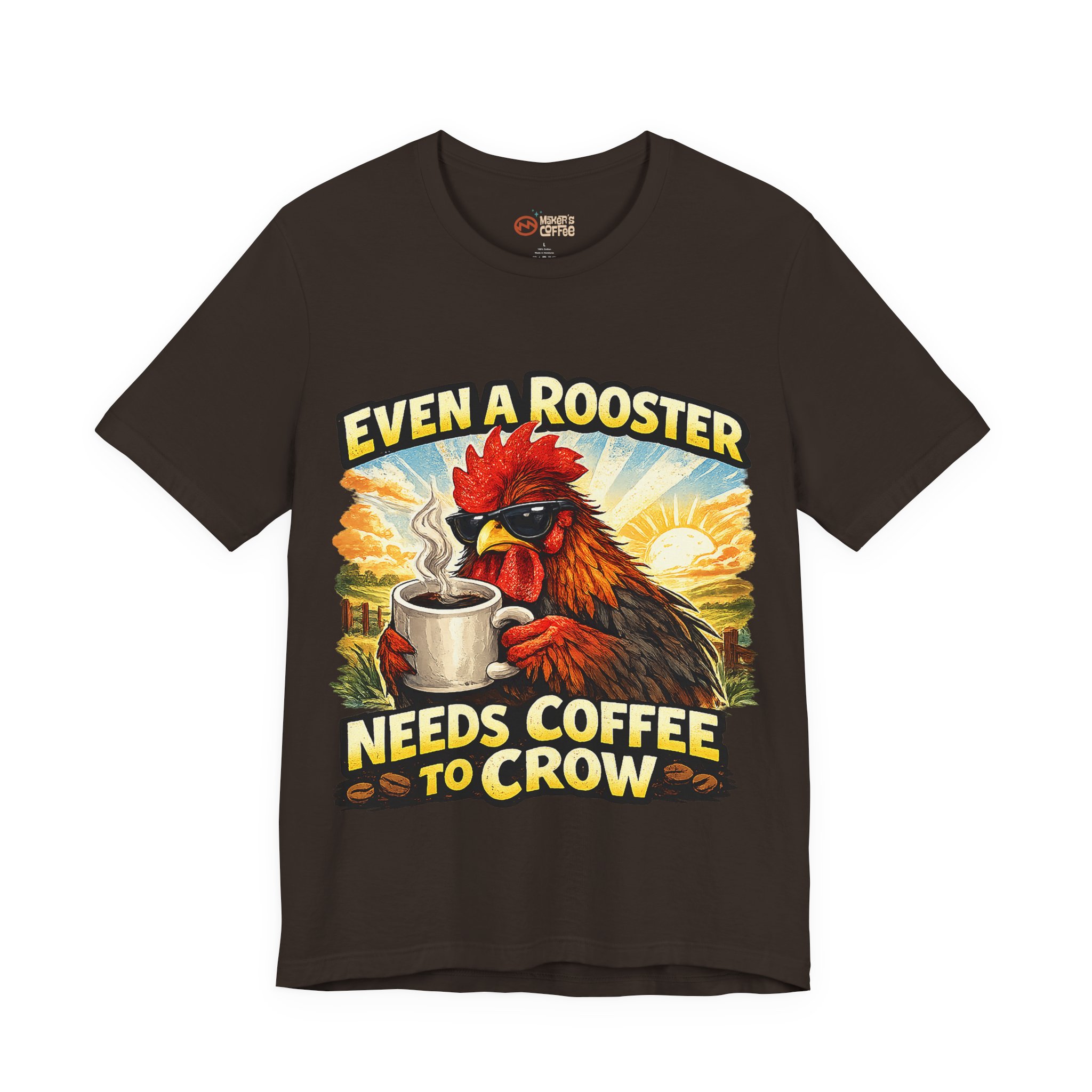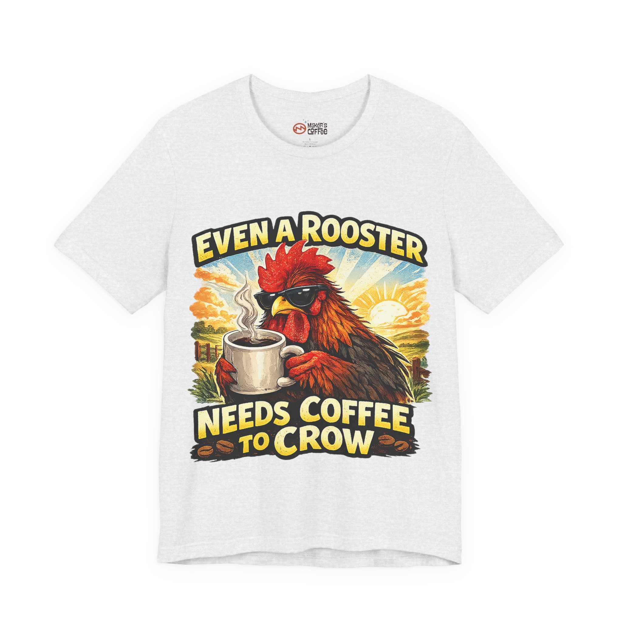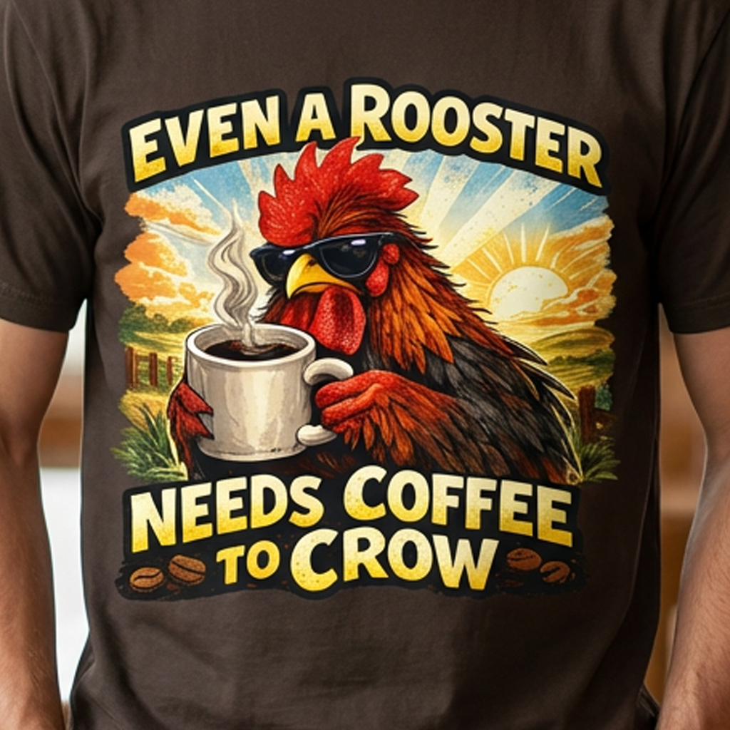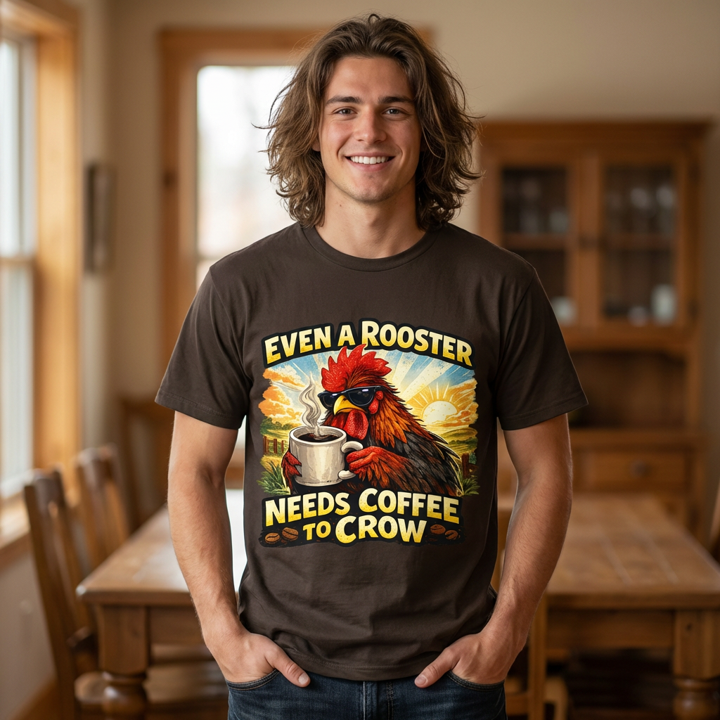 Mornings on the farm just got a little funnier. This lightweight crew tee carries a bold, vintage-style rooster illustration cradling a steaming mug and the cheeky line “Even a Rooster Needs Coffee to Crow.” The colors are warm and sunlit — burnt red, golden yellow, and earthy tones — so the graphic pops whether you’re wearing it at dawn chores or grabbing a coffee in town. Breathable Airlume combed and ring-spun cotton keeps the shirt cool and soft while the retail fit and ribbed collar hold a neat silhouette under a jacket or on its own. Thoughtful details like side seams, shoulder tape, and a tear-away label make it comfortable for all-day wear. It feels like your go-to tee for slow mornings, early barns, and anyone who greets the day best after one good cup.