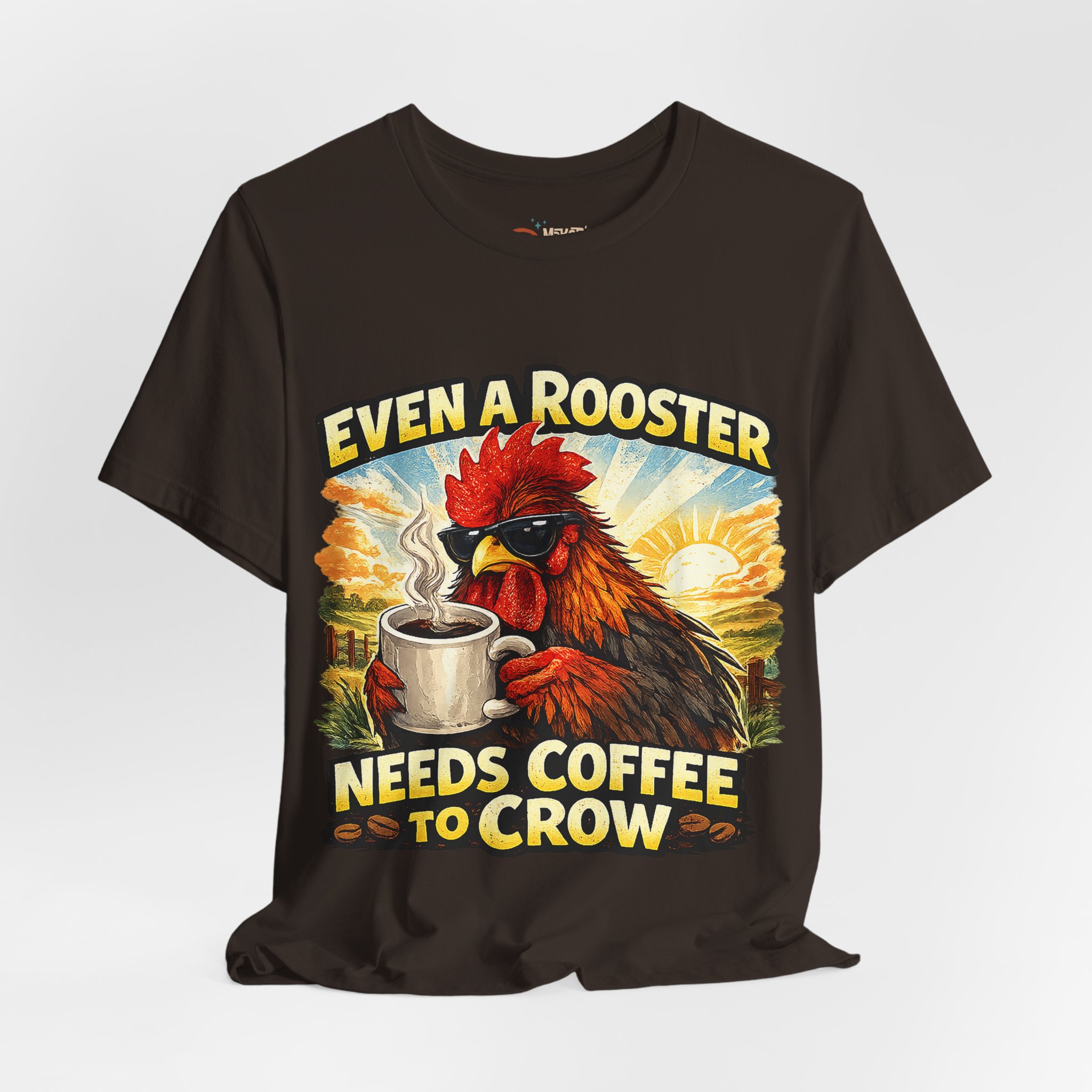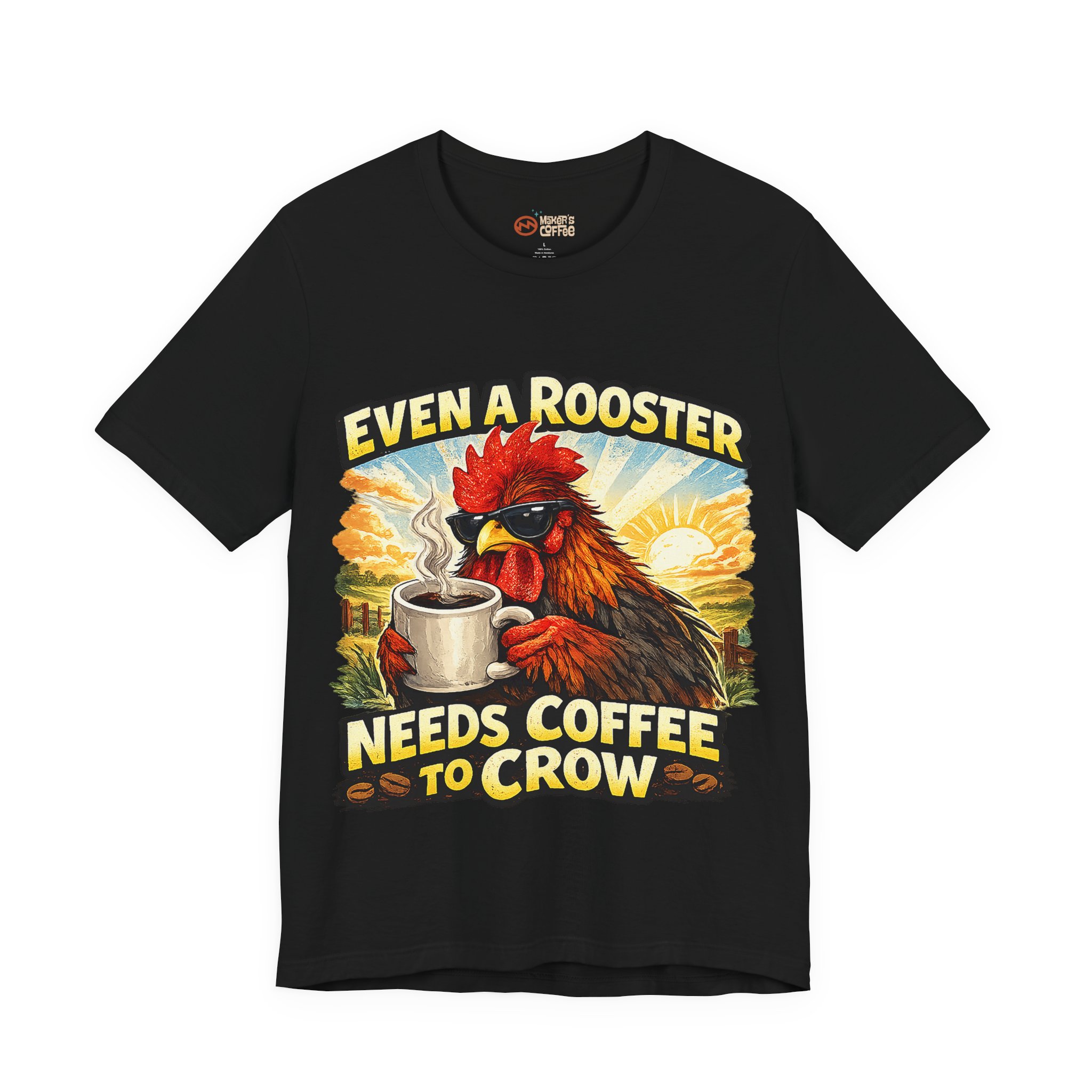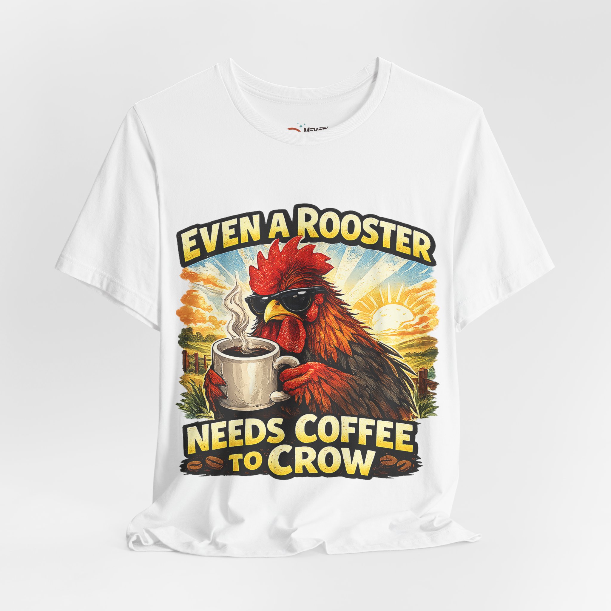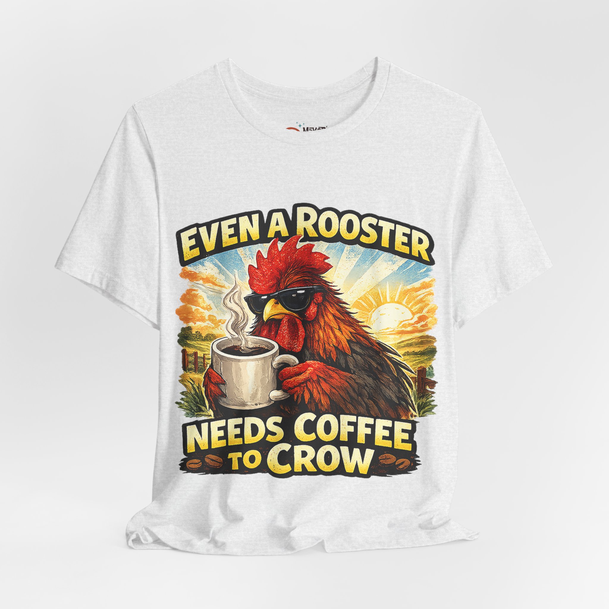 Mornings on the farm just got a little funnier. This lightweight crew tee carries a bold, vintage-style rooster illustration cradling a steaming mug and the cheeky line “Even a Rooster Needs Coffee to Crow.” The colors are warm and sunlit — burnt red, golden yellow, and earthy tones — so the graphic pops whether you’re wearing it at dawn chores or grabbing a coffee in town. Breathable Airlume combed and ring-spun cotton keeps the shirt cool and soft while the retail fit and ribbed collar hold a neat silhouette under a jacket or on its own. Thoughtful details like side seams, shoulder tape, and a tear-away label make it comfortable for all-day wear. It feels like your go-to tee for slow mornings, early barns, and anyone who greets the day best after one good cup.