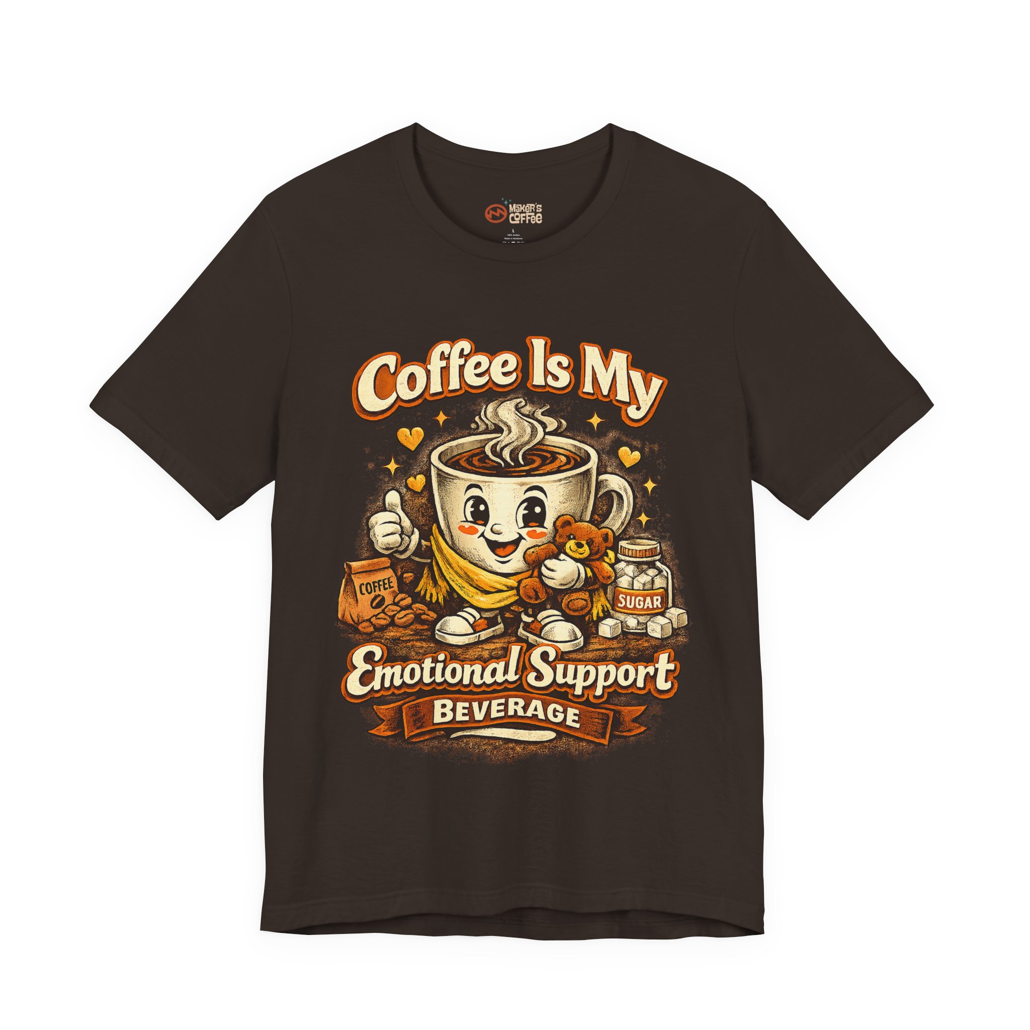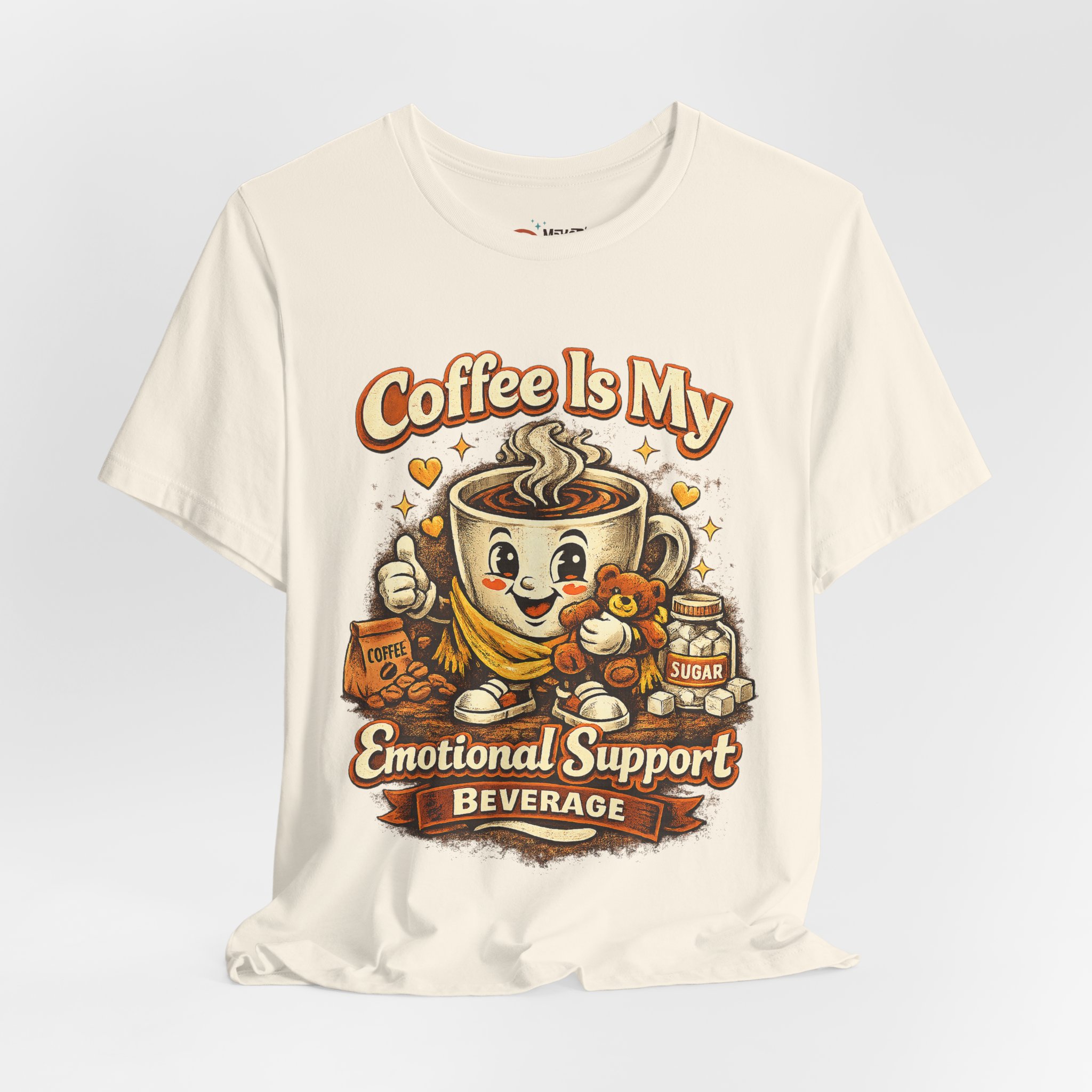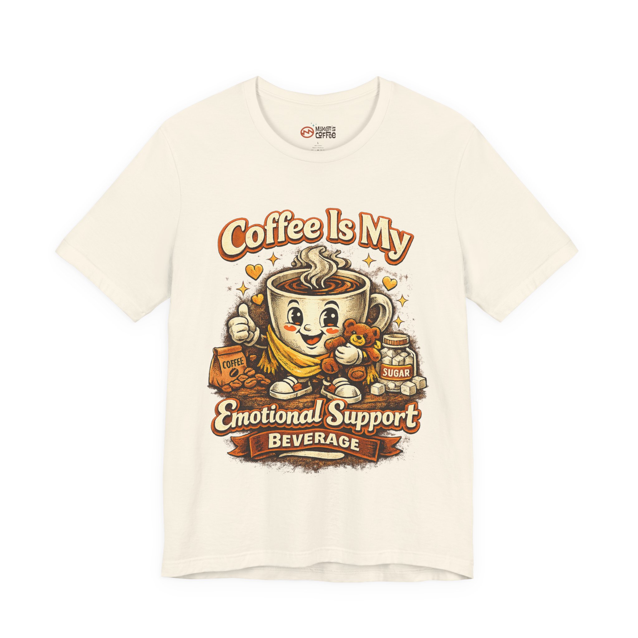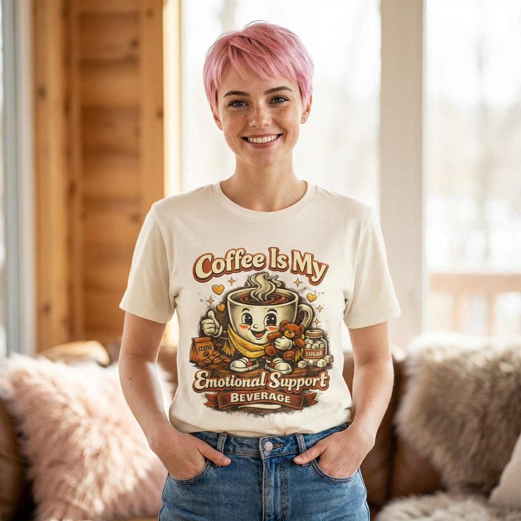 This lightweight jersey tee wears like a quiet nod to the morning ritual — soft, breathable cotton with a quirky and funny graphic that reads “Coffee is me emotional support beverage” The relaxed retail fit and classic crew neckline make it easy to layer under a cardigan or throw on with jeans. Subtle vintage-inspired ink tones and a simple steaming mug illustration lend a warm, lived-in look that feels like your favorite coffee shop catchphrase brought to fabric. Ethically produced and finished with ribbed collar, side seams, and a tear-away label for comfort, it’s designed to move with your day whether you’re brewing, commuting, or lingering over a first cup.