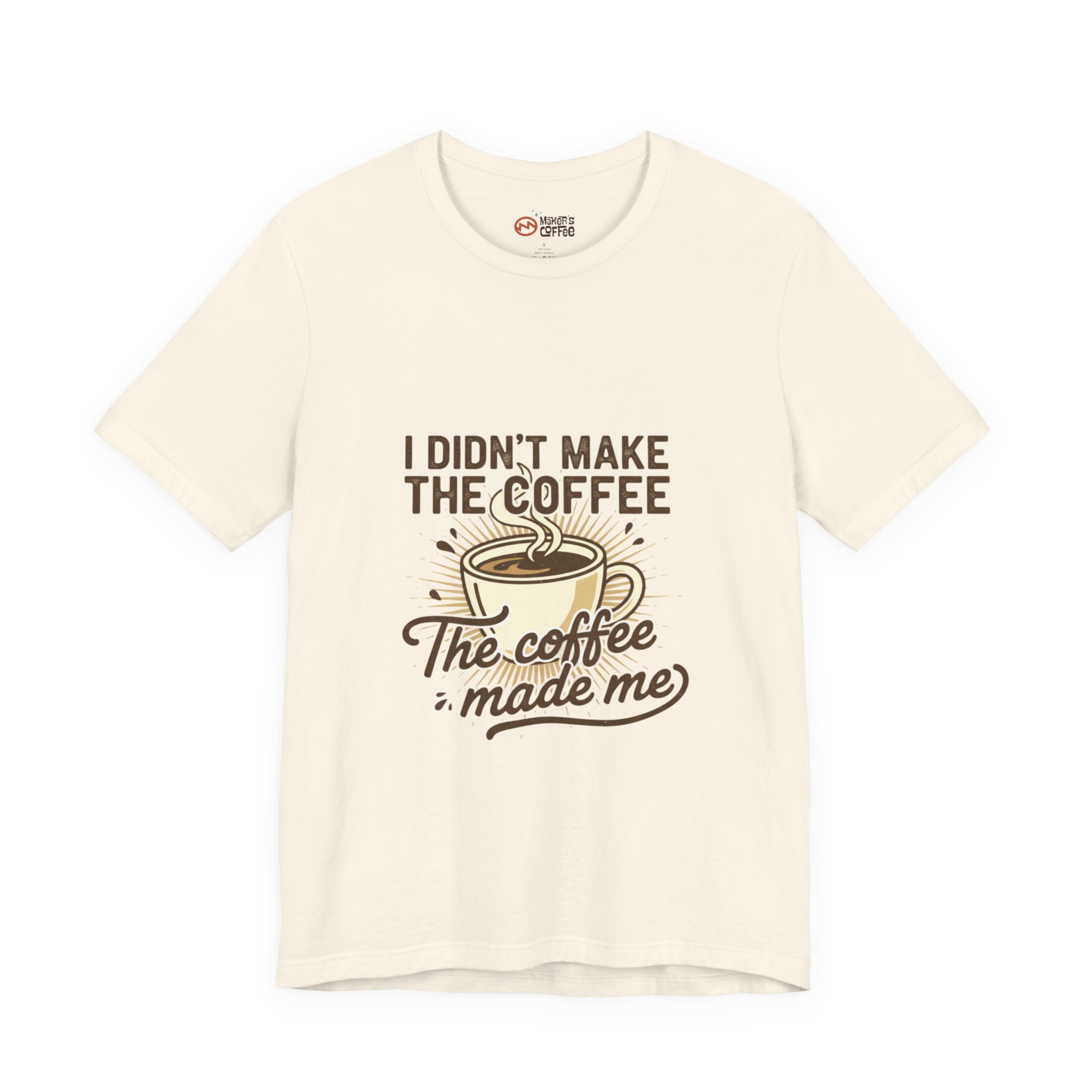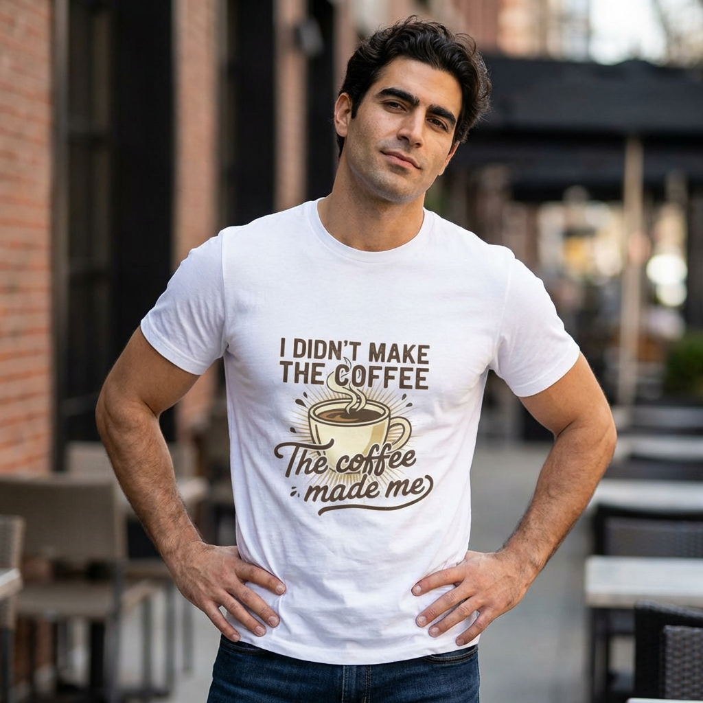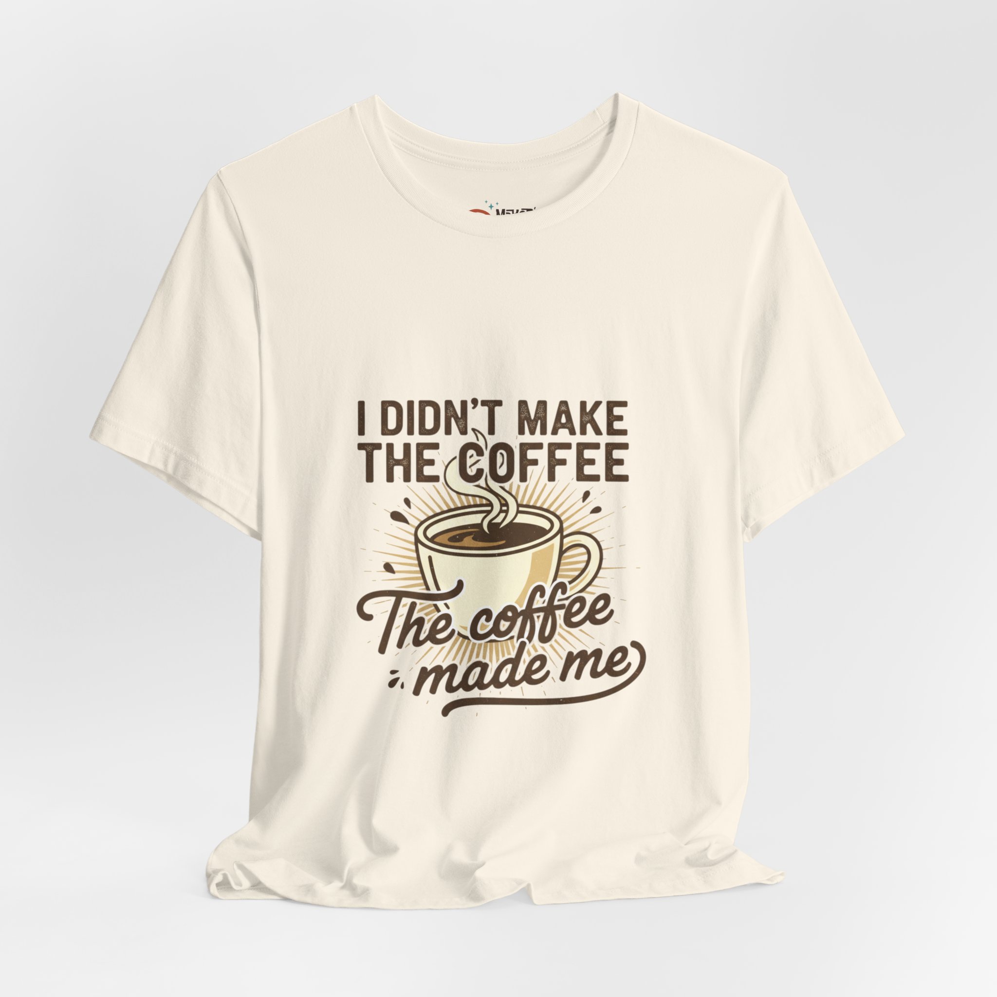 This lightweight jersey tee wears like a quiet nod to the morning ritual — soft, breathable cotton with a casually confident graphic that reads “I didn’t make the coffee — the coffee made me.” The relaxed retail fit and classic crew neckline make it easy to layer under a cardigan or throw on with jeans. Subtle vintage-inspired ink tones and a simple steaming mug illustration lend a warm, lived-in look that feels like your favorite coffee shop catchphrase brought to fabric. Ethically produced and finished with ribbed collar, side seams, and a tear-away label for comfort, it’s designed to move with your day whether you’re brewing, commuting, or lingering over a first cup.