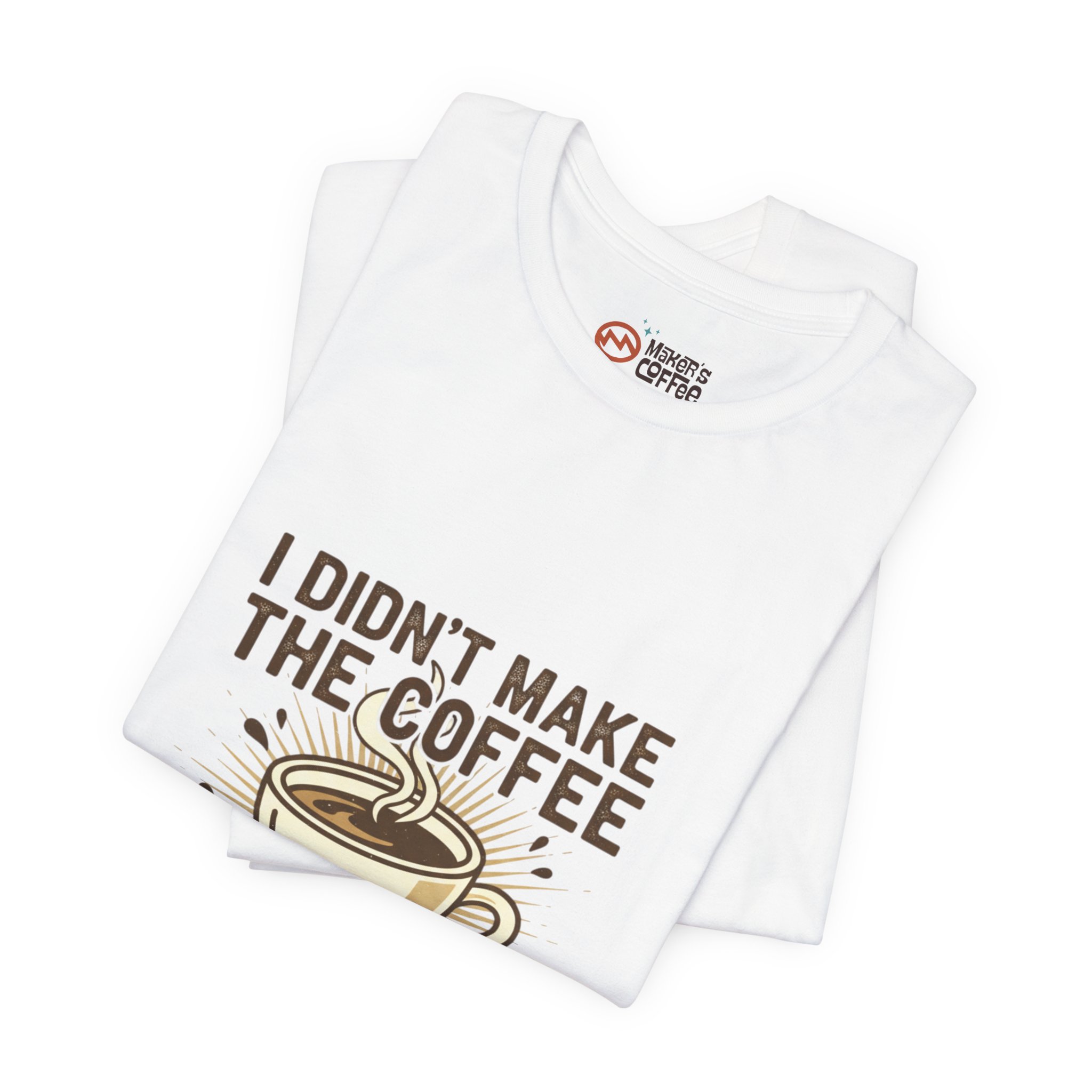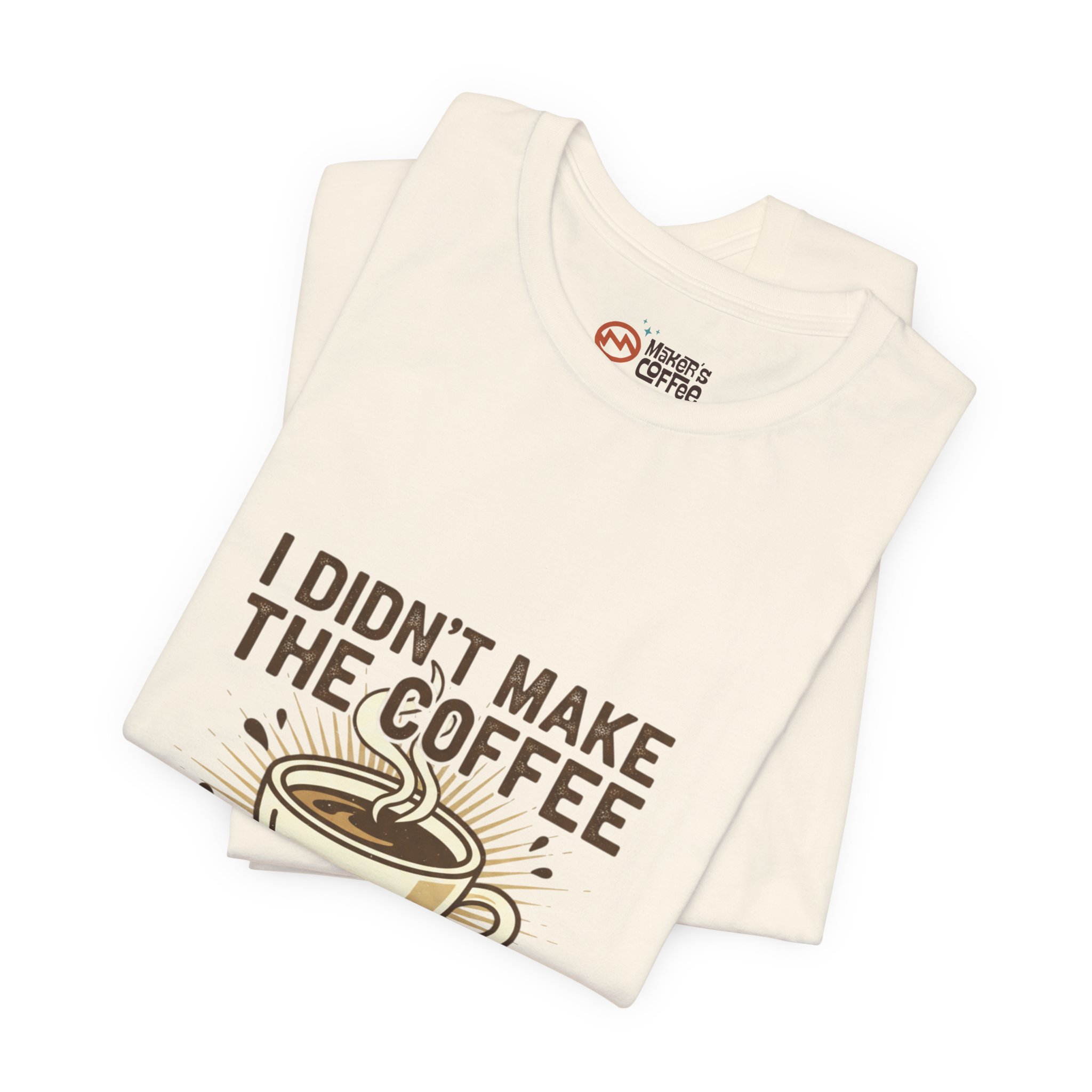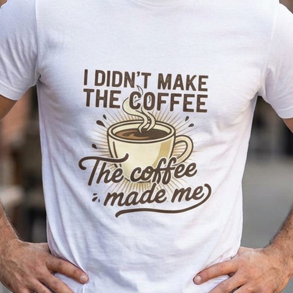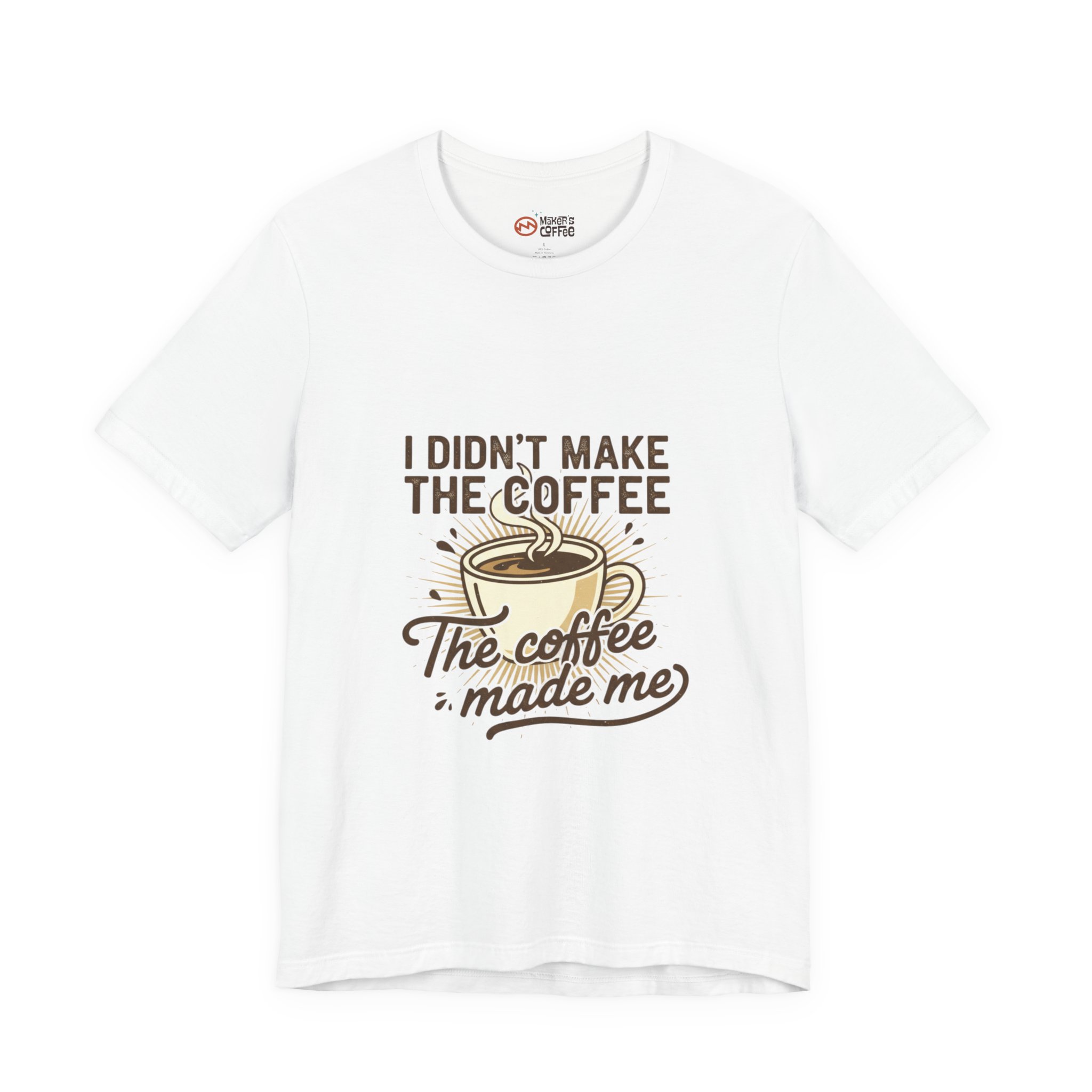 This lightweight jersey tee wears like a quiet nod to the morning ritual — soft, breathable cotton with a casually confident graphic that reads “I didn’t make the coffee — the coffee made me.” The relaxed retail fit and classic crew neckline make it easy to layer under a cardigan or throw on with jeans. Subtle vintage-inspired ink tones and a simple steaming mug illustration lend a warm, lived-in look that feels like your favorite coffee shop catchphrase brought to fabric. Ethically produced and finished with ribbed collar, side seams, and a tear-away label for comfort, it’s designed to move with your day whether you’re brewing, commuting, or lingering over a first cup.