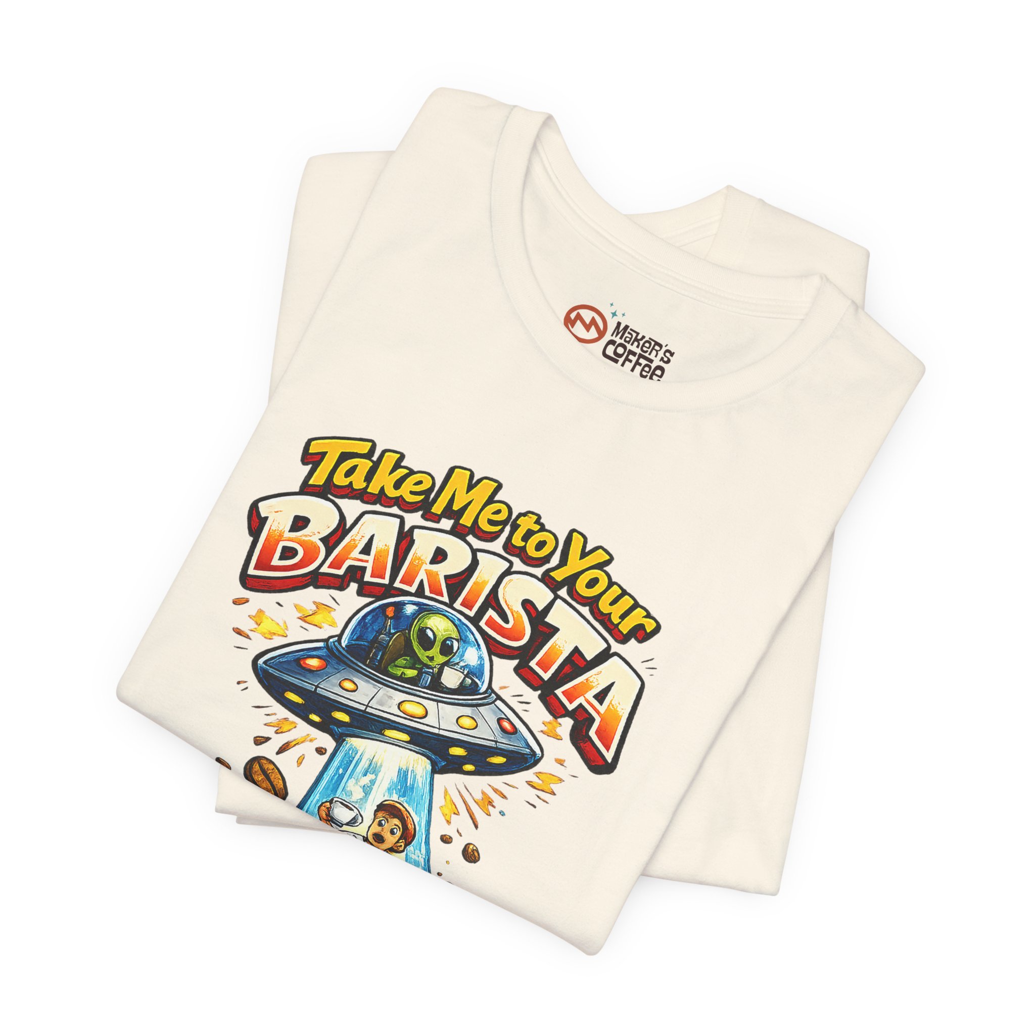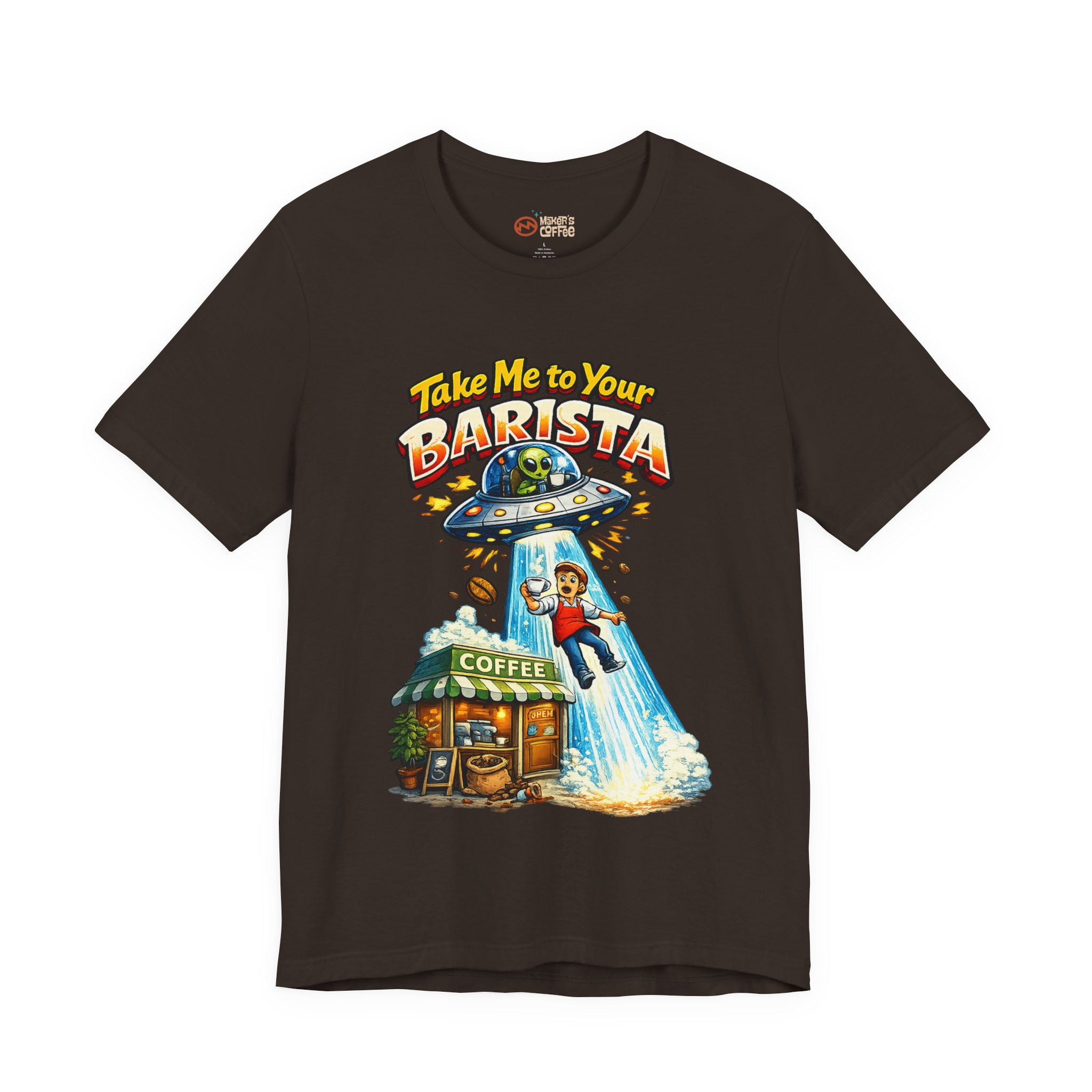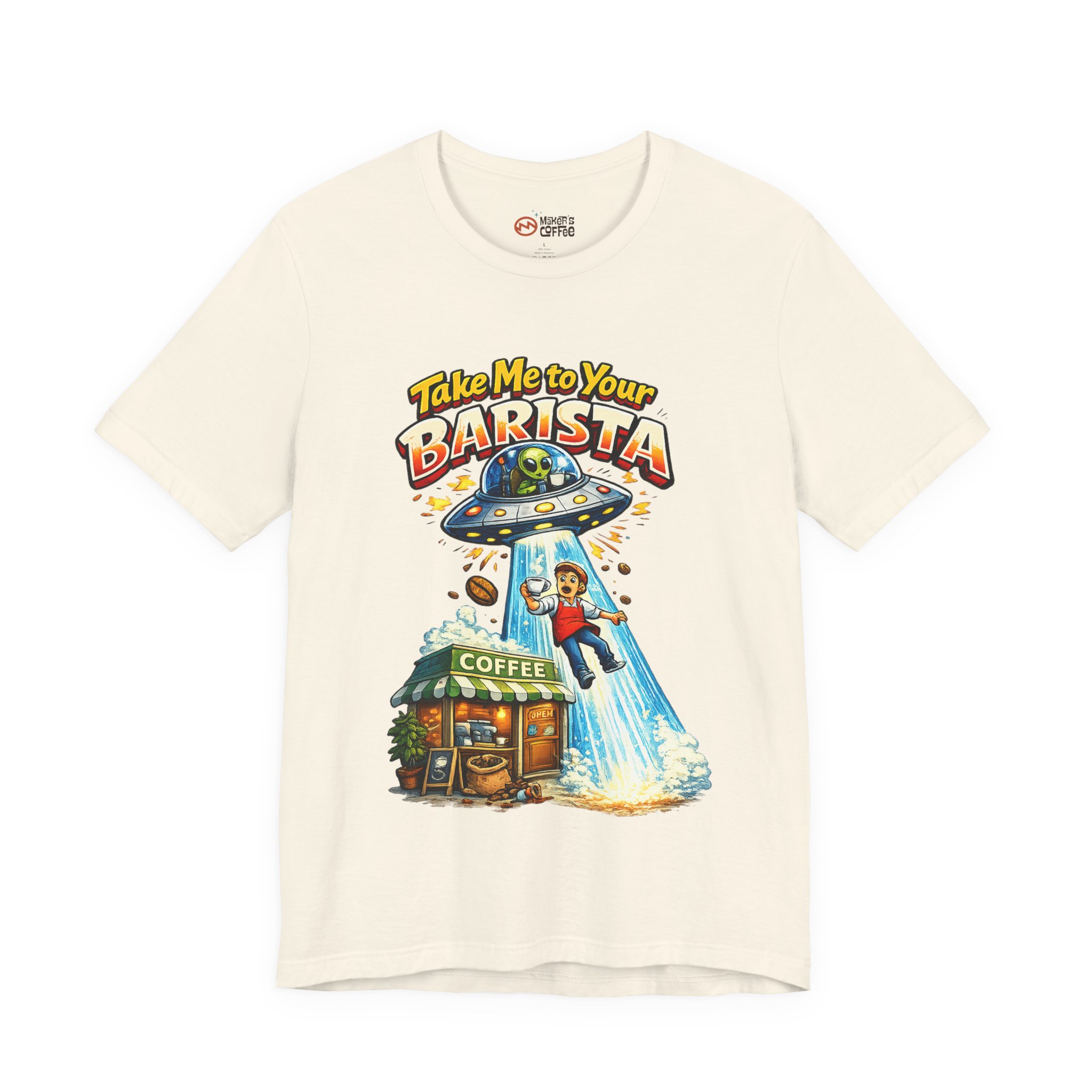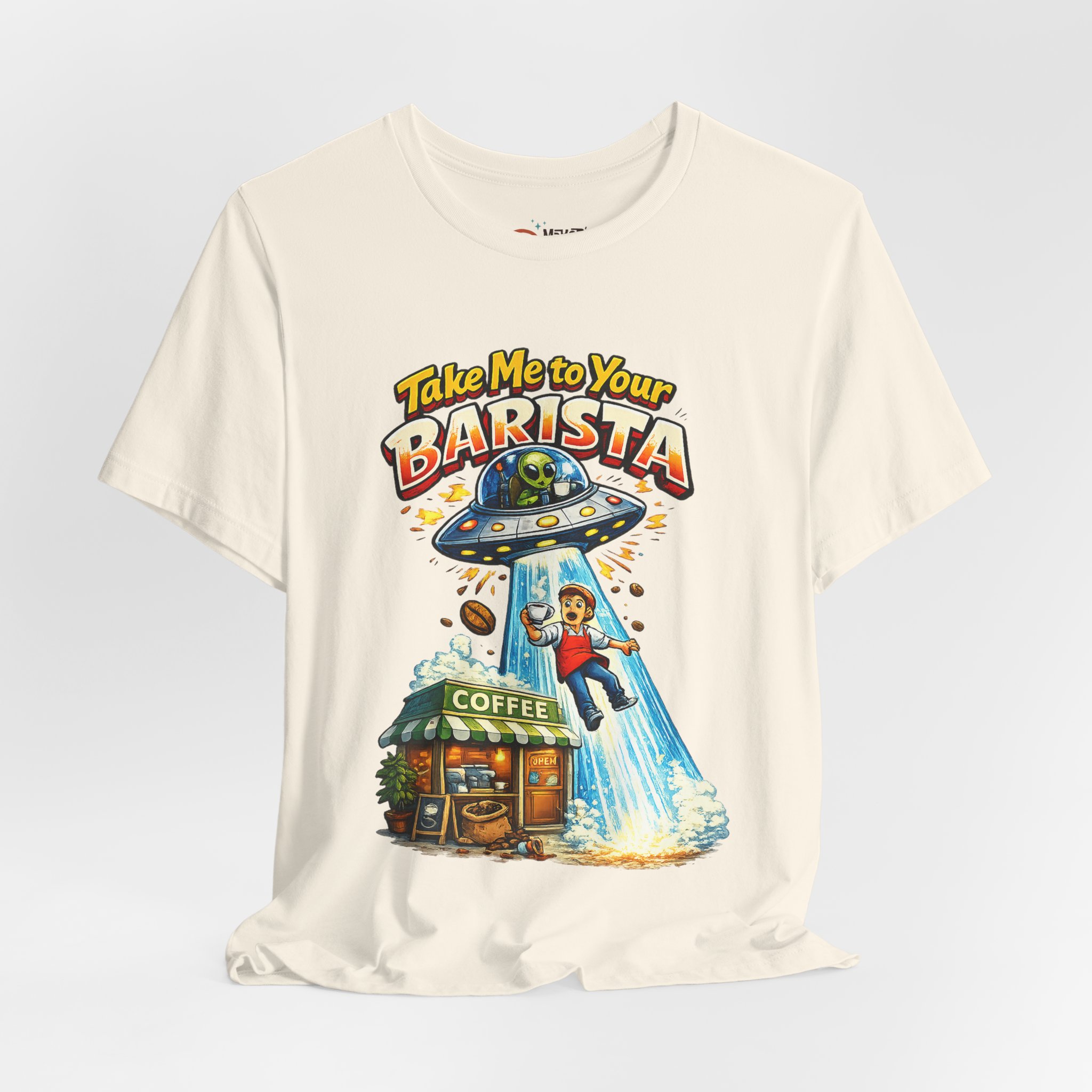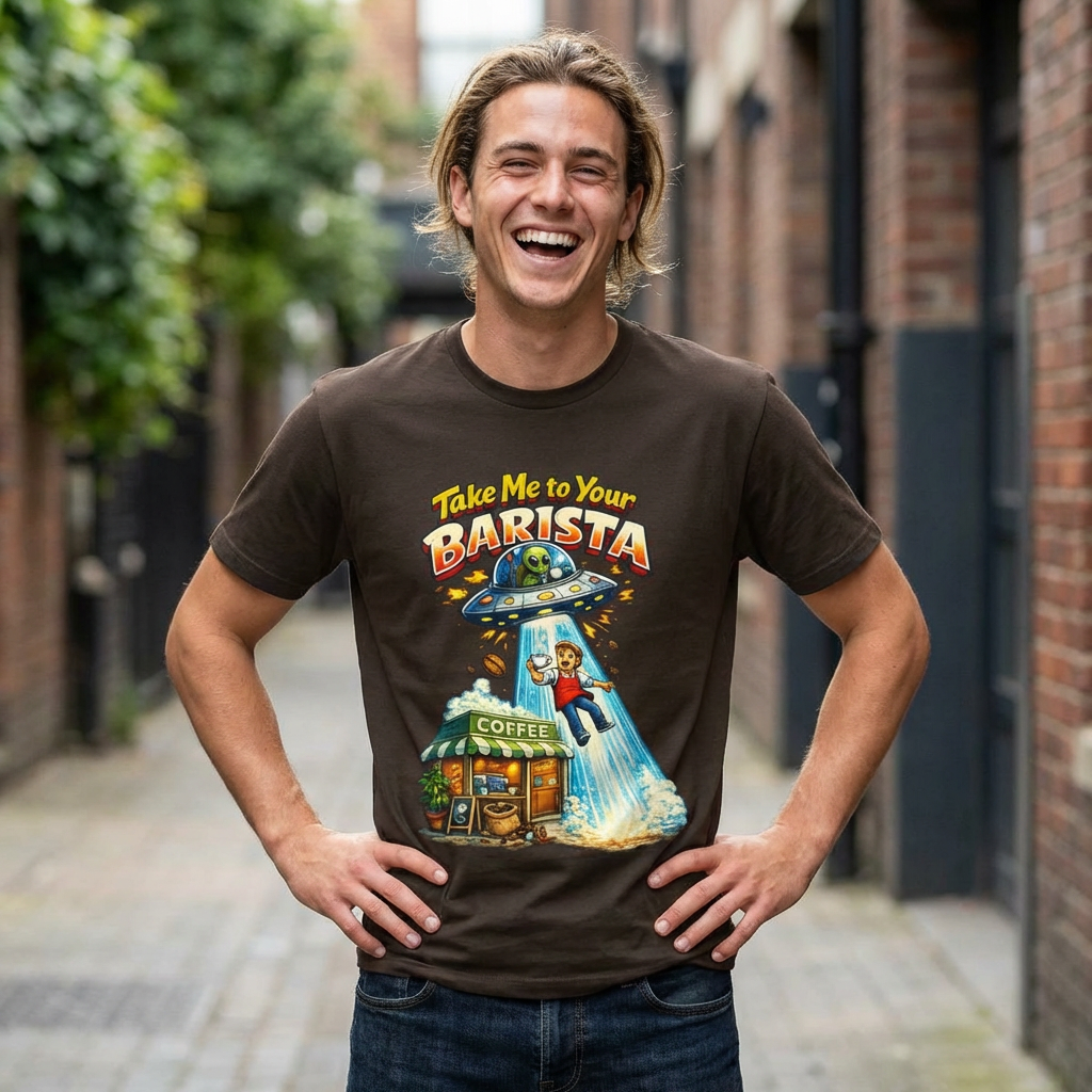 This lightweight jersey tee wears like a quiet nod to the morning ritual — soft, breathable cotton with a quirky and funny graphic that reads “Take Me To Your Barista” The relaxed retail fit and classic crew neckline make it easy to layer under a cardigan or throw on with jeans. Subtle vintage-inspired ink tones and a simple steaming mug illustration lend a warm, lived-in look that feels like your favorite coffee shop catchphrase brought to fabric. Ethically produced and finished with ribbed collar, side seams, and a tear-away label for comfort, it’s designed to move with your day whether you’re brewing, commuting, or lingering over a first cup.