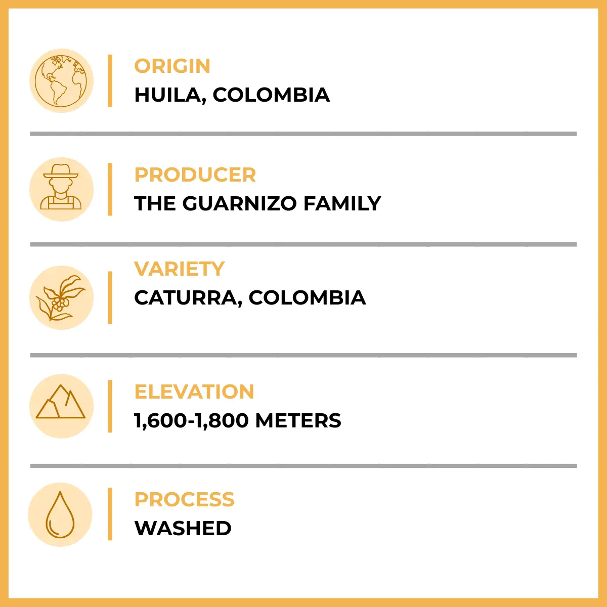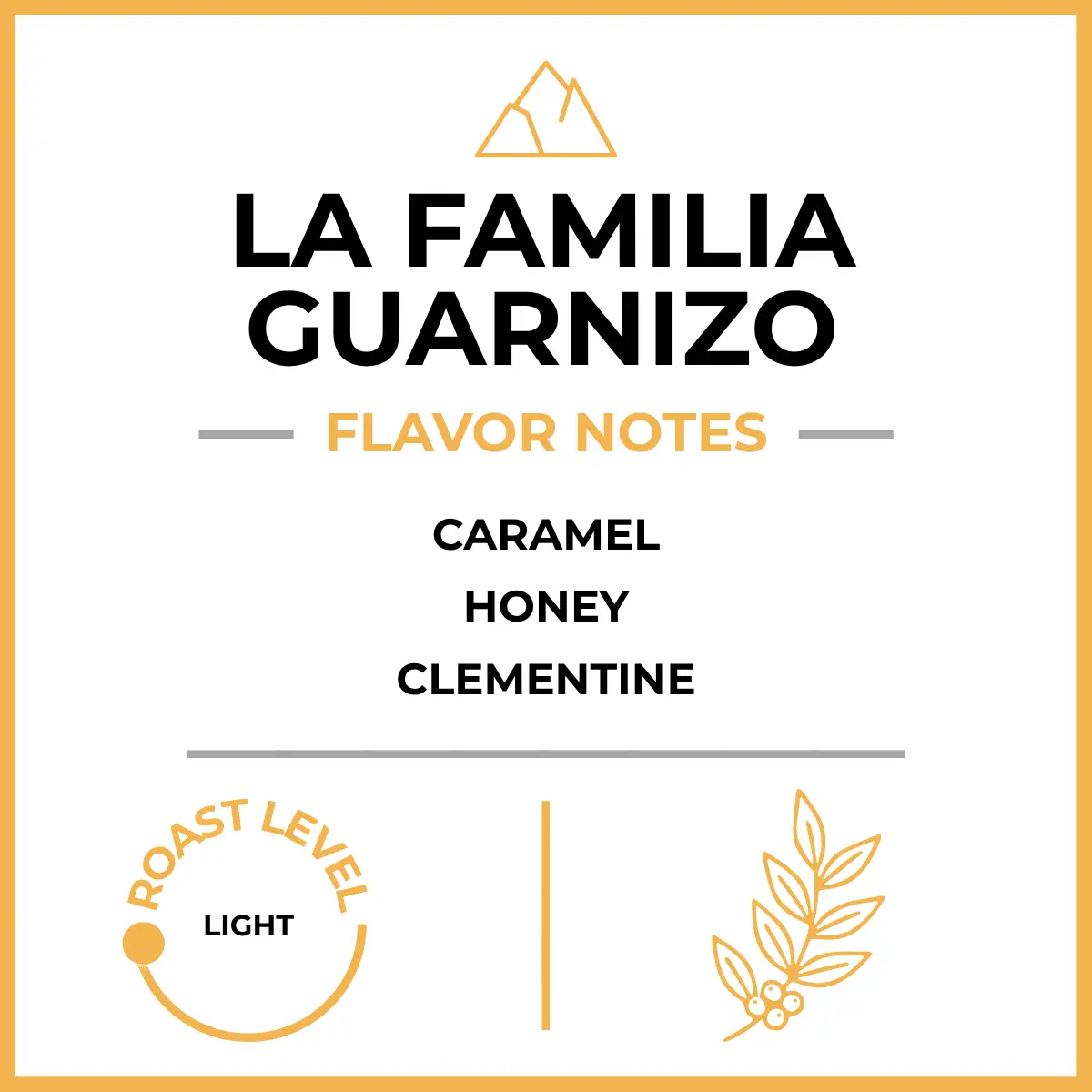 Colombia La Familia Guarnizo is a light roast single-origin coffee from Huila, Colombia, produced by the Guarnizo Family. With notes of caramel, honey, and clementine, it offers a bright, light-bodied cup with balanced acidity.