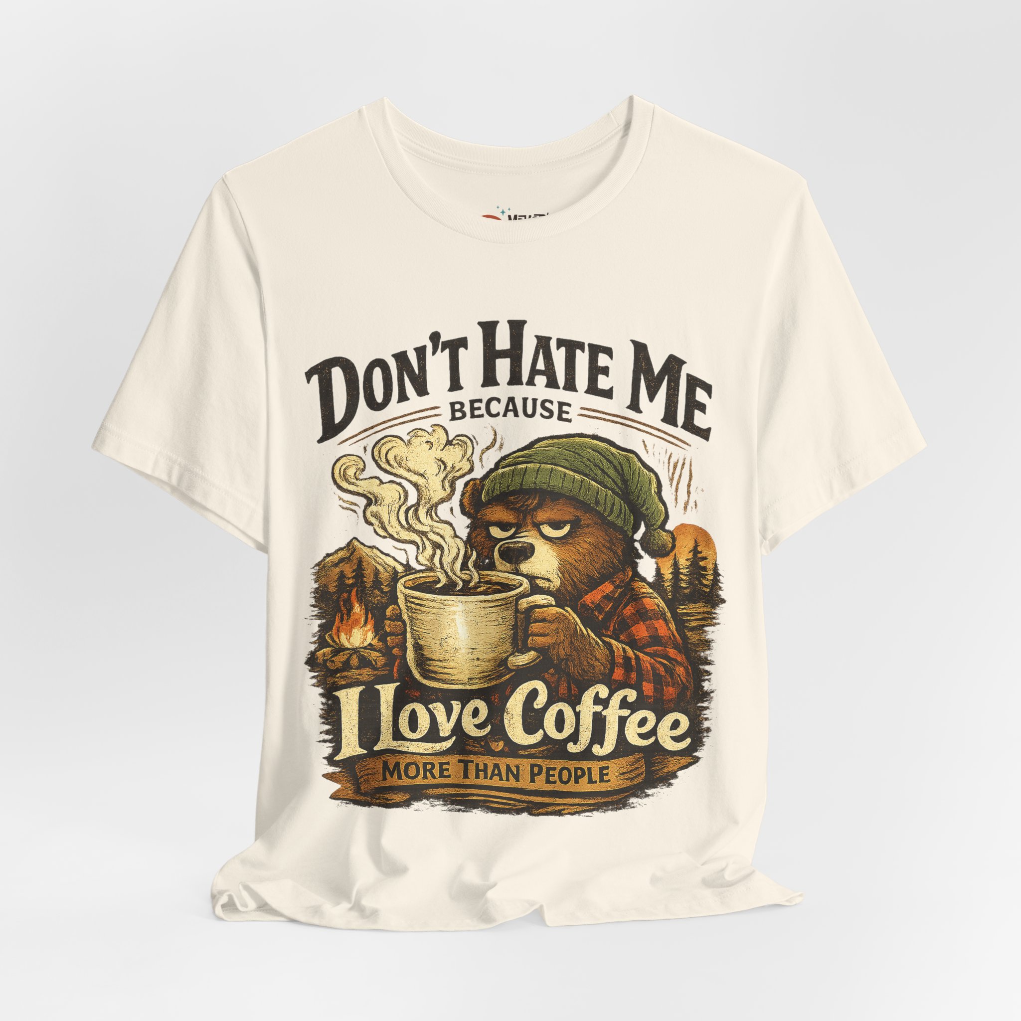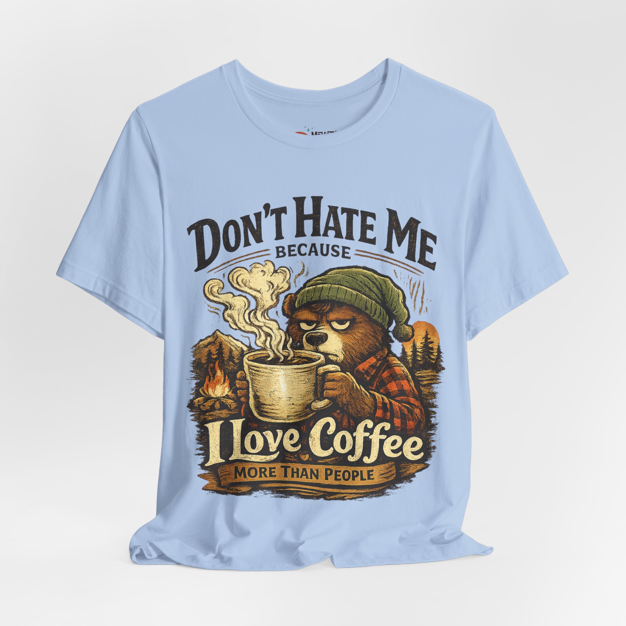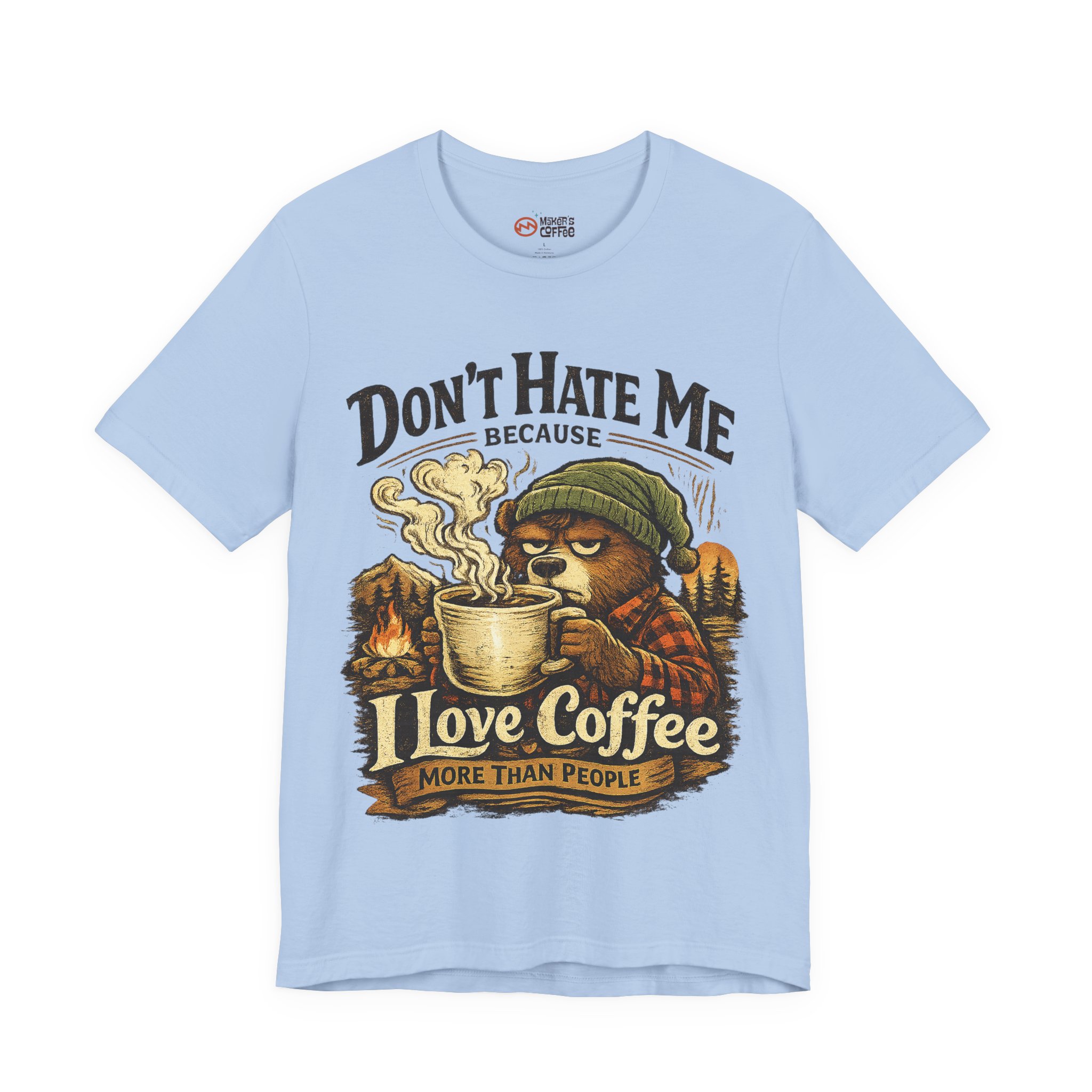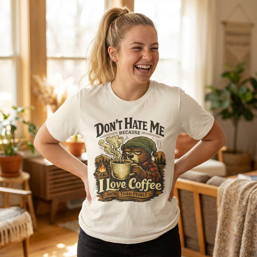 A soft, breathable jersey tee that speaks to slow mornings, campfire warmth, and a serious relationship with coffee. The front art shows a sleepy, beanie-wearing character cradling a steaming mug among pine silhouettes, with the cheeky line “Don’t Hate Me Because I Love Coffee More Than People.” The lightweight Airlume combed cotton feels gentle on skin and layers easily under flannels or jackets. Subtle vintage tones in the print give a worn-in, outdoorsy vibe — great for coffee runs, trail-side breaks, or low-key hangouts where comfort and personality matter.