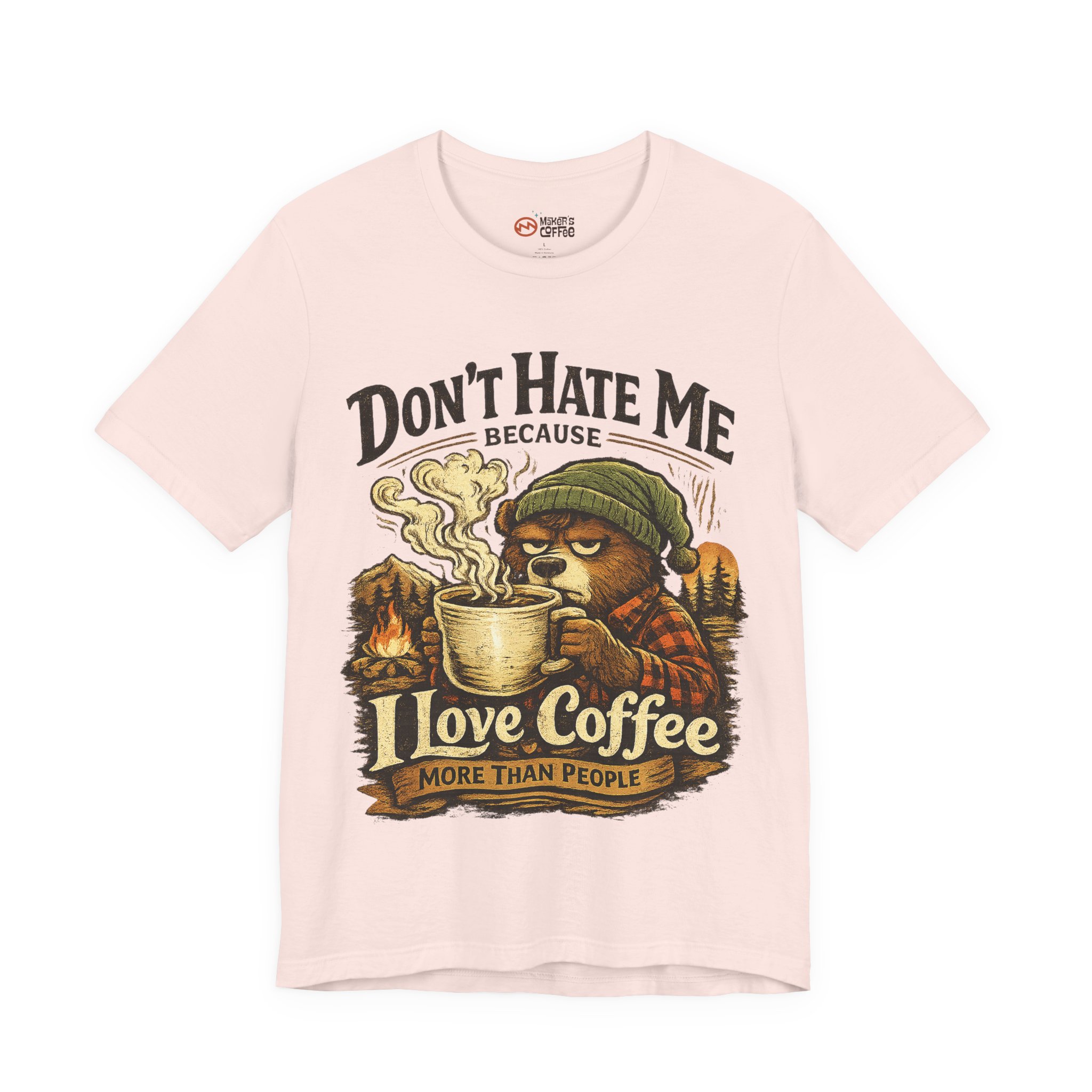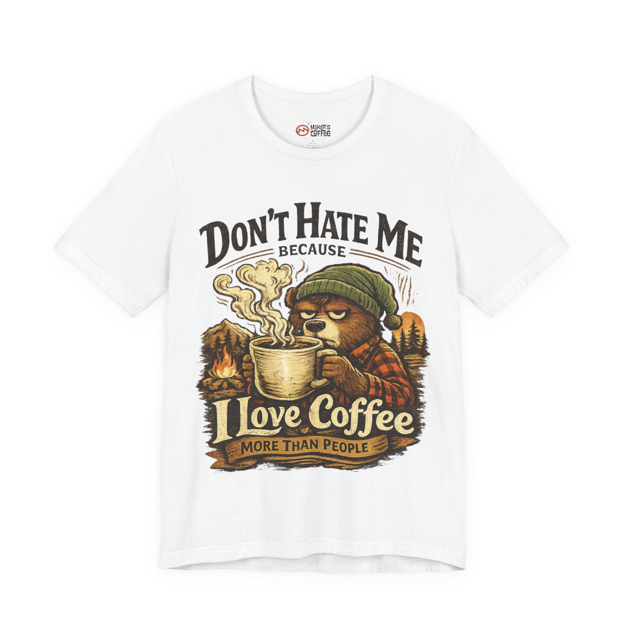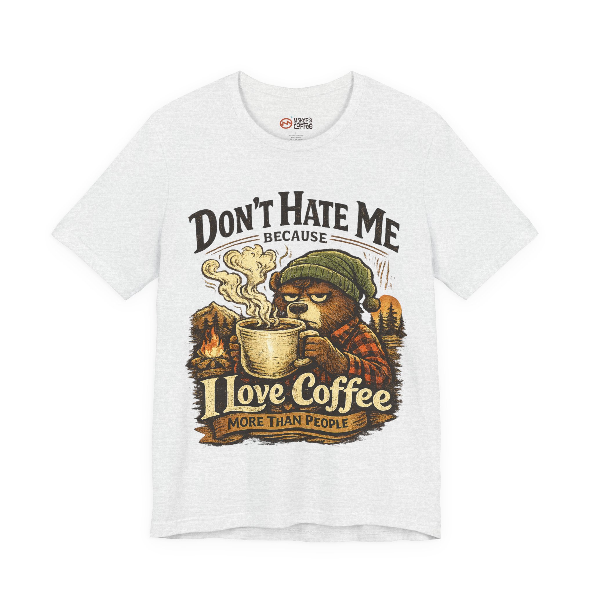 A soft, breathable jersey tee that speaks to slow mornings, campfire warmth, and a serious relationship with coffee. The front art shows a sleepy, beanie-wearing character cradling a steaming mug among pine silhouettes, with the cheeky line “Don’t Hate Me Because I Love Coffee More Than People.” The lightweight Airlume combed cotton feels gentle on skin and layers easily under flannels or jackets. Subtle vintage tones in the print give a worn-in, outdoorsy vibe — great for coffee runs, trail-side breaks, or low-key hangouts where comfort and personality matter.