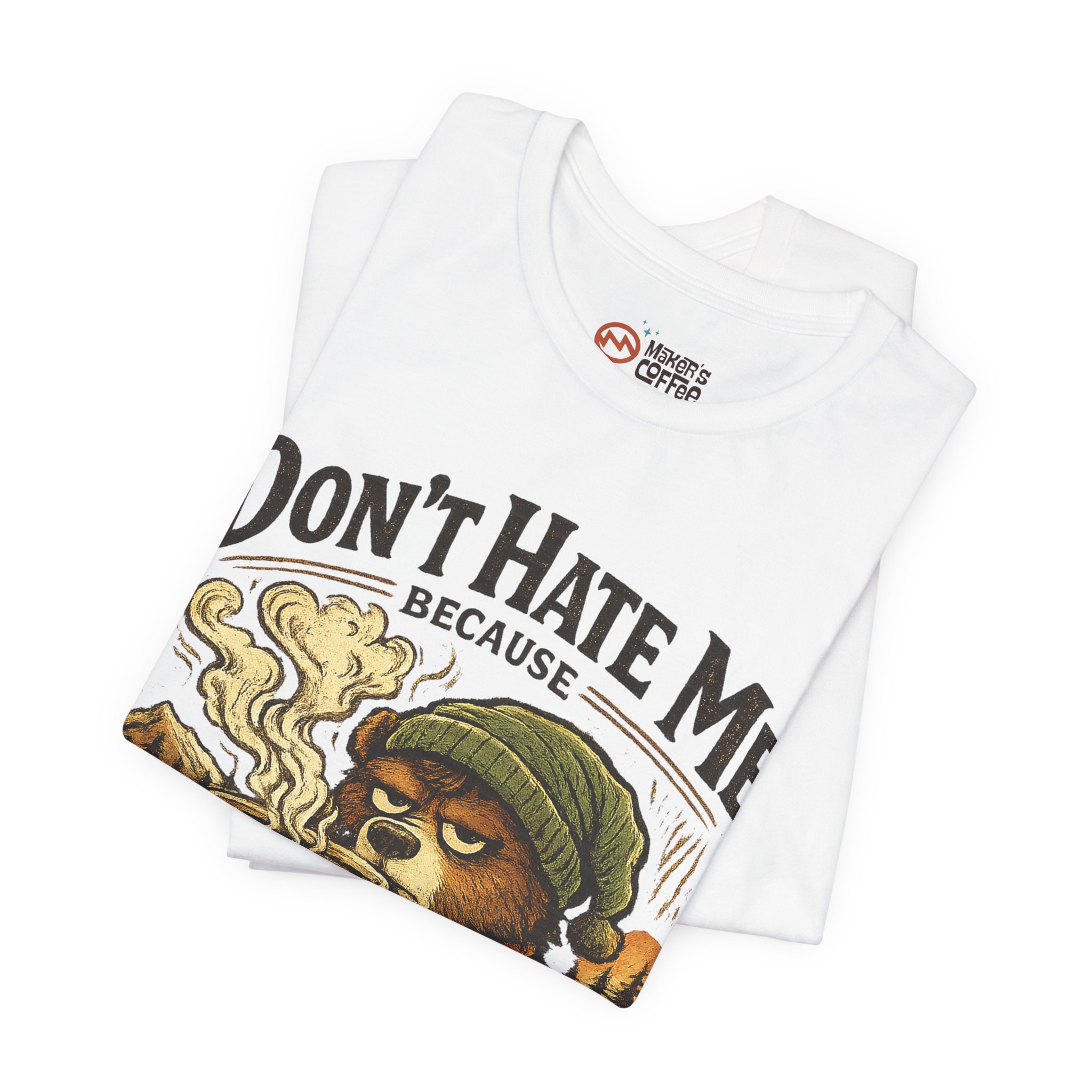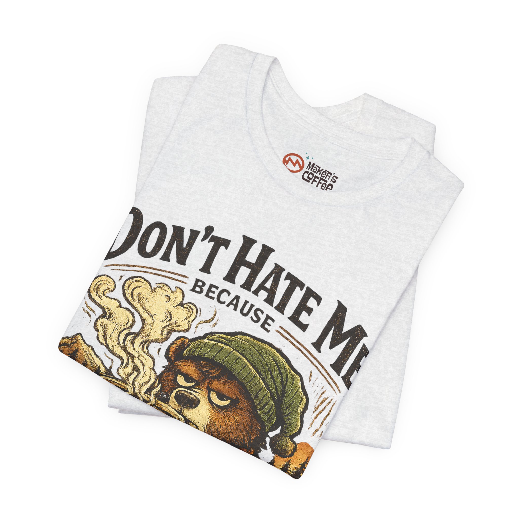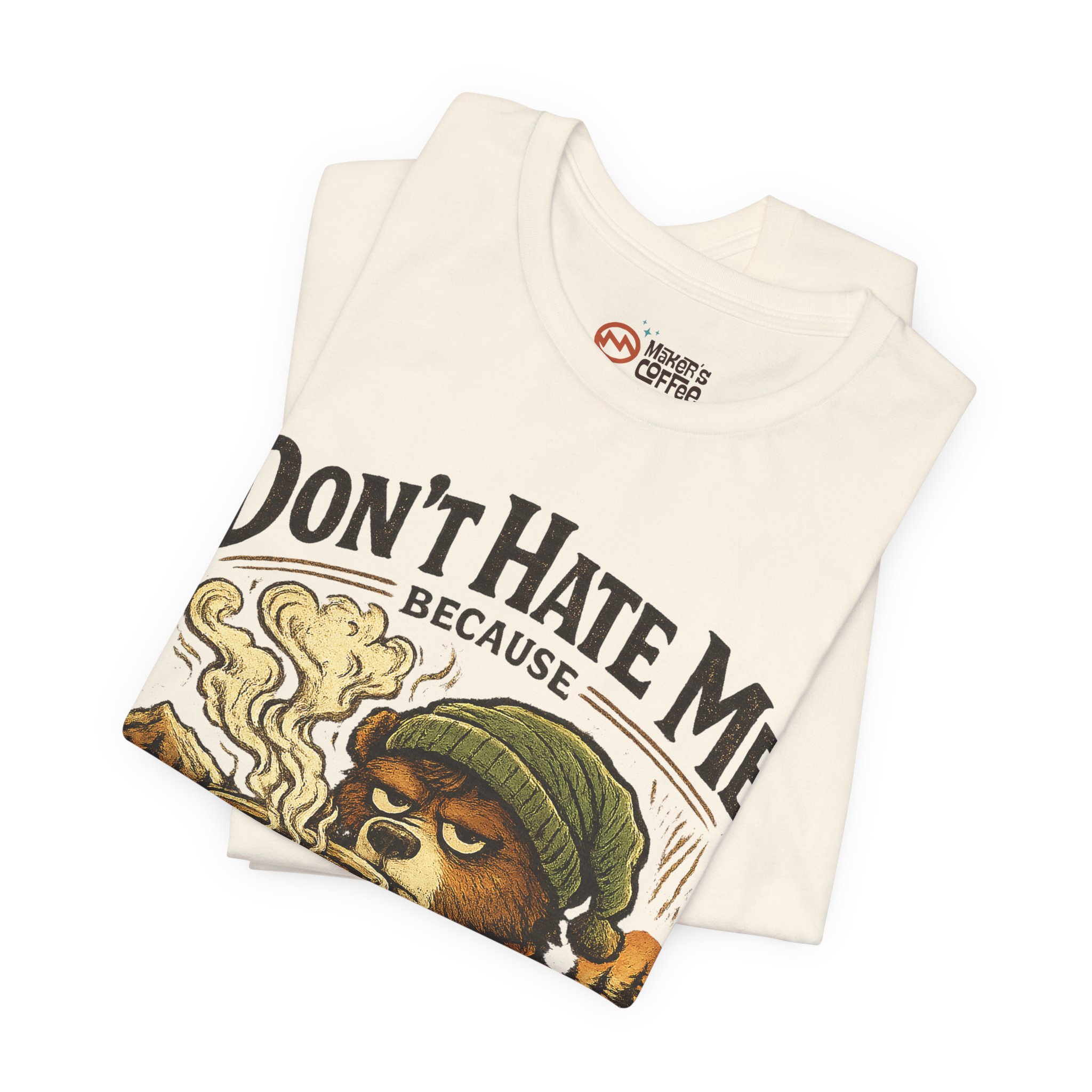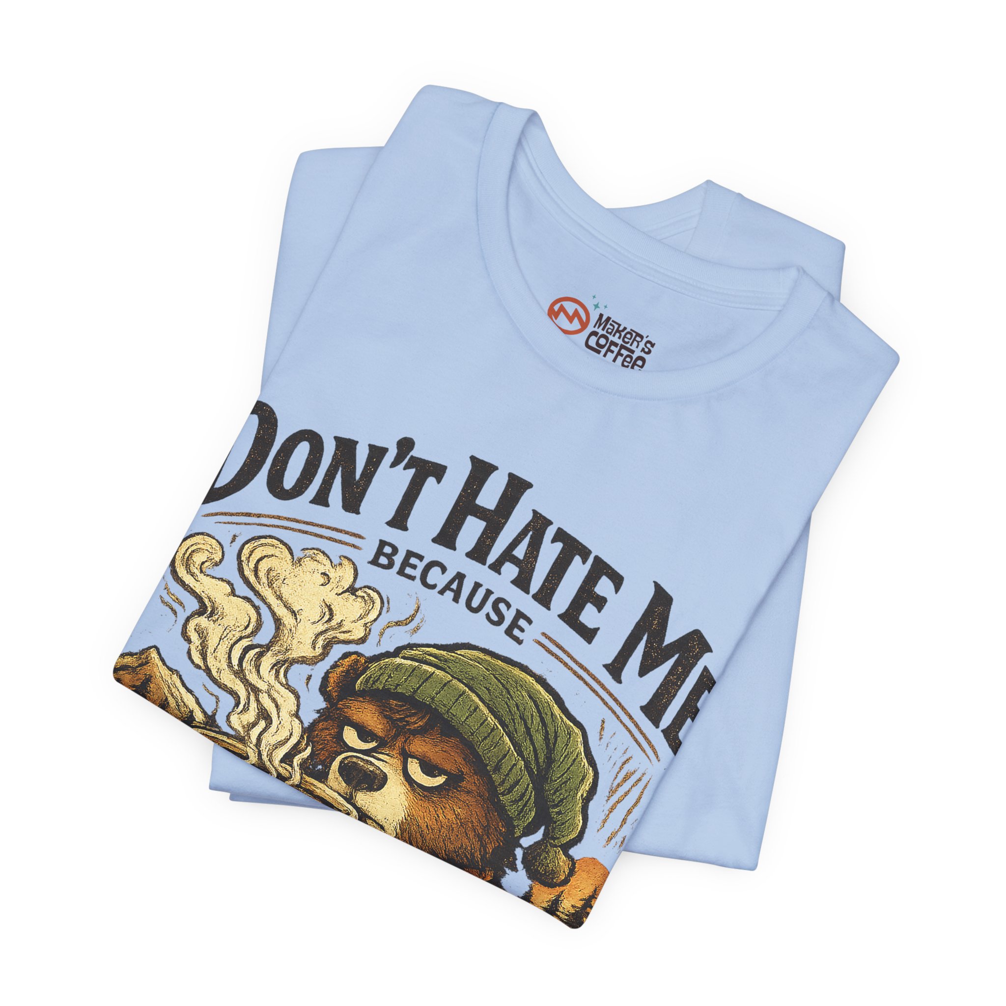A soft, breathable jersey tee that speaks to slow mornings, campfire warmth, and a serious relationship with coffee. The front art shows a sleepy, beanie-wearing character cradling a steaming mug among pine silhouettes, with the cheeky line “Don’t Hate Me Because I Love Coffee More Than People.” The lightweight Airlume combed cotton feels gentle on skin and layers easily under flannels or jackets. Subtle vintage tones in the print give a worn-in, outdoorsy vibe — great for coffee runs, trail-side breaks, or low-key hangouts where comfort and personality matter.