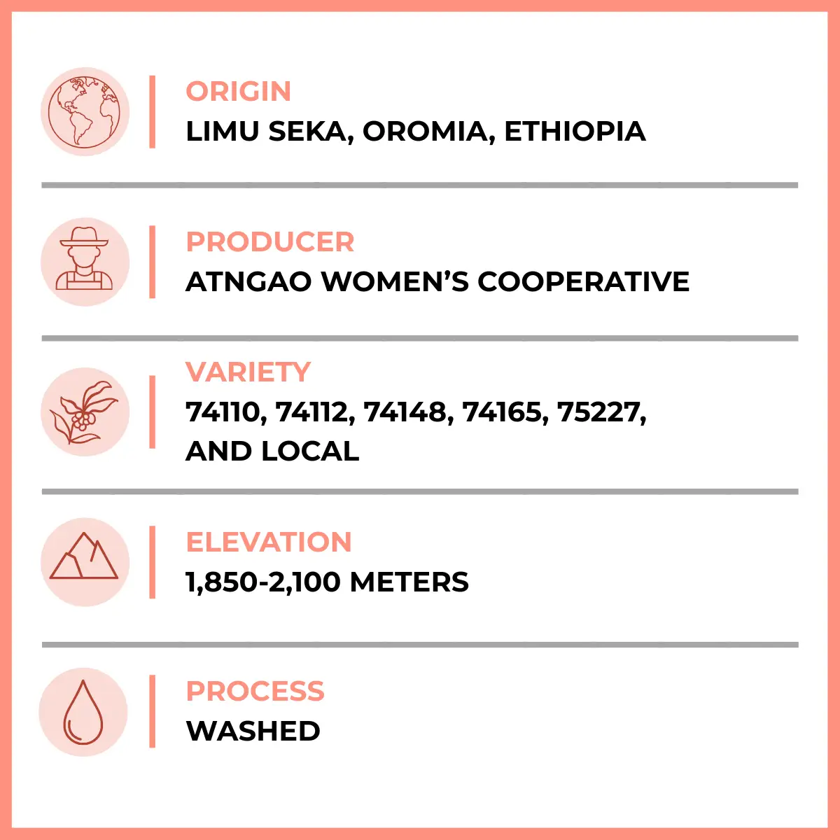 The Village is a light roast, single‑origin coffee sourced from Limu Seka in the Oromia region of Ethiopia, grown collaboratively by the Atnago Women’s Cooperative at elevations between 1850–2100 meters above sea level. The lot includes multiple indigenous Ethiopian, and local varieties, all washed process to emphasize clarity, floral aromatics, and layered sweetness.