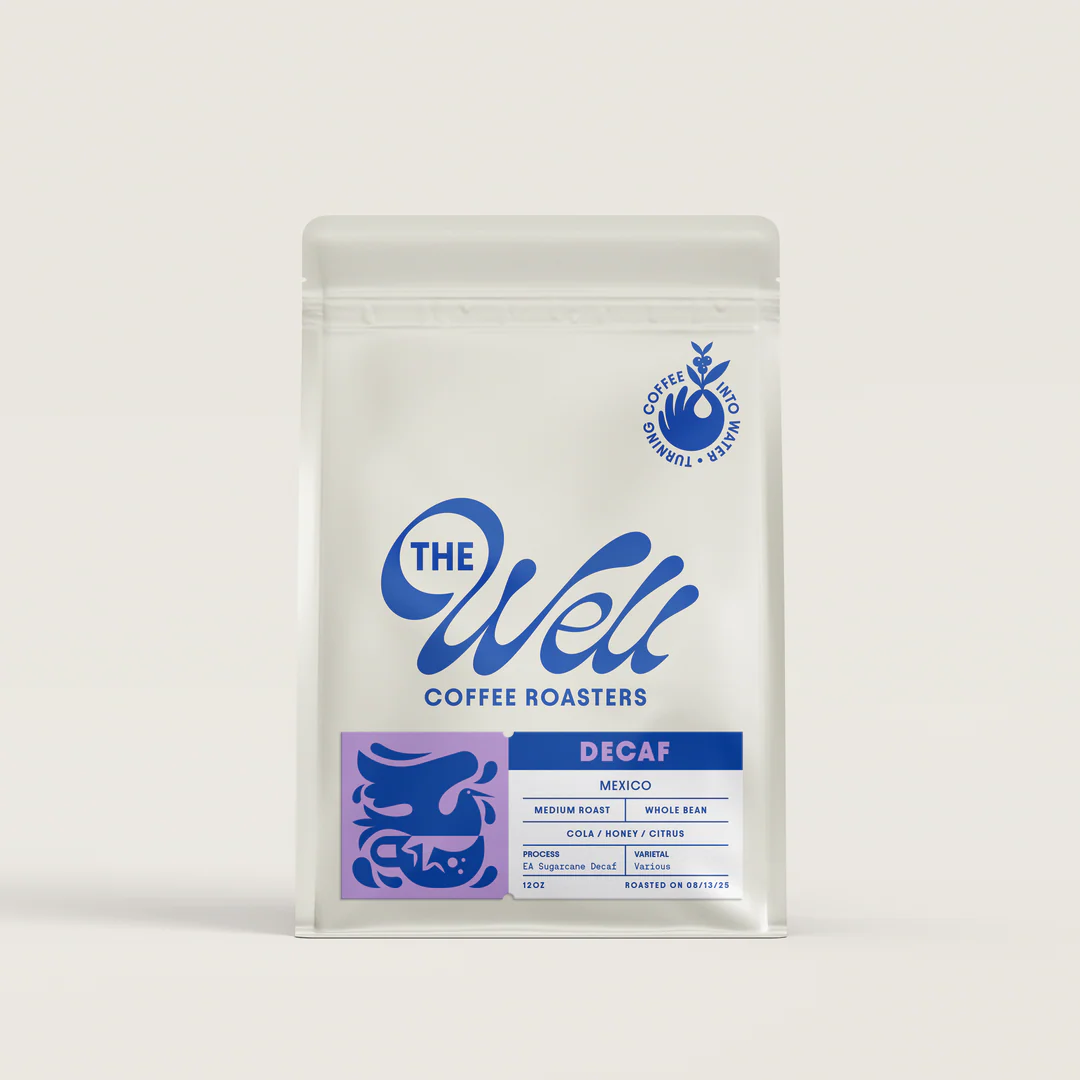 The Well Coffeehouse Decaf is a medium roast from Veracruz, Mexico, featuring cola, honey, and citrus notes. It’s smooth, flavorful, and has been decaffeinated .